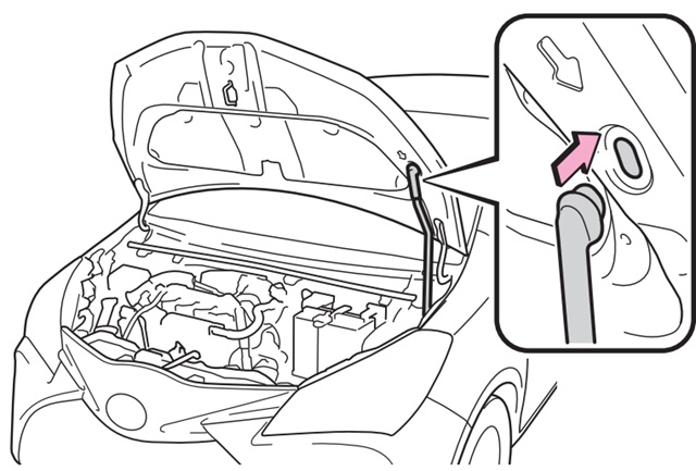 ↓ ボンネットを固定するロッドを起こして所定の位置に差し込んでボンネットを固定します。